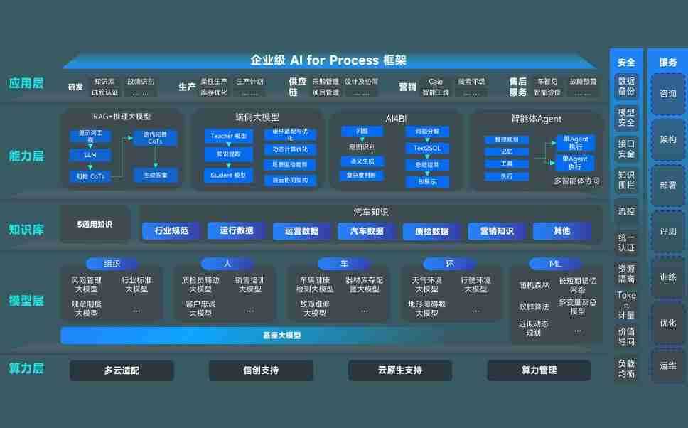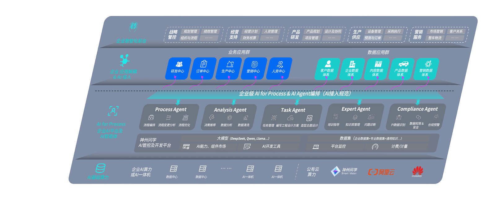 端到端的一站式AI工作空间深度融合了从企业战略规划到日常经营的全流程业务板块,,定向解决车企内部领域多、、、、部门多、、链条长、、、、场景碎片化等难题,,,,支持车企快速构建以AI为核心的生产力写作体系,,实现任务执行与AI能力的无缝集成与交互