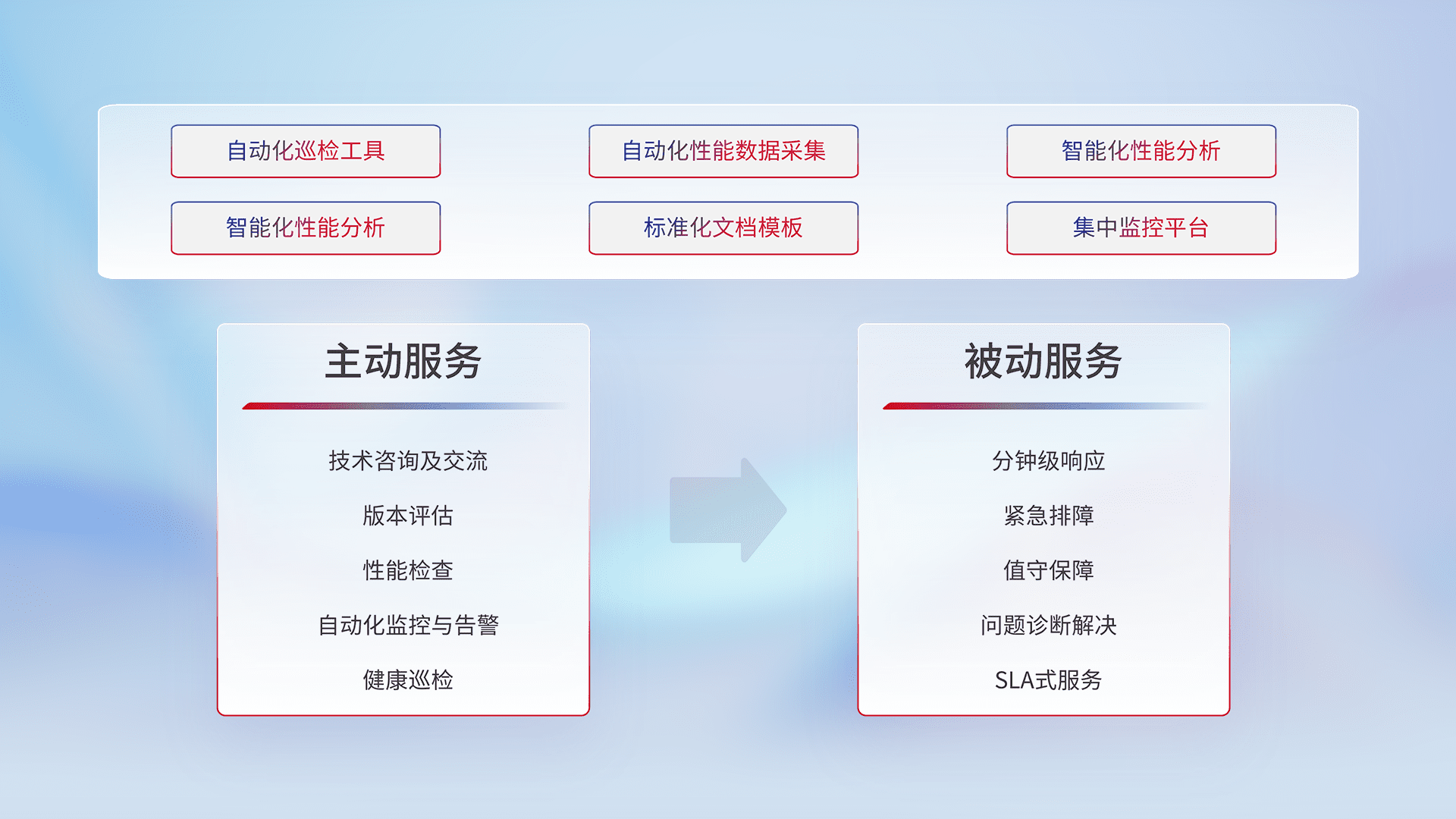 智能化工具和标准化文档,,保障服务质量,,,提供主动服务(包含技术咨询、、、版本评估、、、性能检查、、、、自动化监控与告警、、健康巡检)和被动服务包含(分钟级响应、、、、紧急排障、、值守保障、、问题诊断解决、、、SLA服务)。。。。